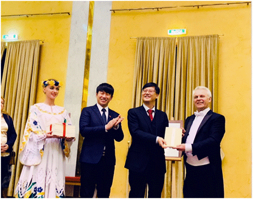 国际人文欧亚学会名誉院士巴勒诺夫斯基·瓦切斯拉夫·维克多维奇在捐赠仪式上致辞,他说,2017年扈鲁先生夫人问墨女士曾携他们的葫芦画作来到白俄罗斯举办了盛大的文化展演活动,引起了广大民众浓厚的兴趣,让我们对中国的葫芦文化、中国的传统文化有了直观深刻的了解,在白俄罗斯产生了良好的反响。今天,我们再一次有幸欣赏到扈鲁先生高水准的葫芦画作, 特别是扈鲁先生非常慷慨地把他们团队的研究成果《葫芦文化丛书》赠送给了我们,这不仅促进了白中两国之间的文化艺术交流,更加深了我们之间的友谊!今后,白中两国文化艺术家将共同践行“伟大的丝绸之路”精神,将白中文化艺术交流推向新的高峰!